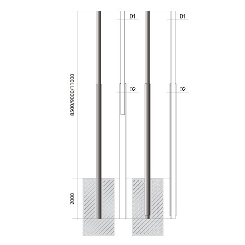 • Прямостоечные граненые силовые опоры устанавливаются в заранее подготовленный котлован на глубину равную длине их подземной части, в последствии бетонируются.